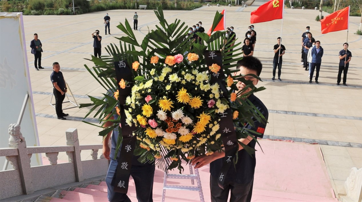 在当地疫情防控政策允许下,全体成员于上午9点来到烈士陵园,园内庄严肃穆又生机勃勃,在人民烈士纪念碑前开始活动。活动伊始,由教师党员代表和员工党员代表共同向先烈敬献花篮。随后,全体师生向纪念碑默哀、鞠躬致敬,表达对革命烈士的敬意。