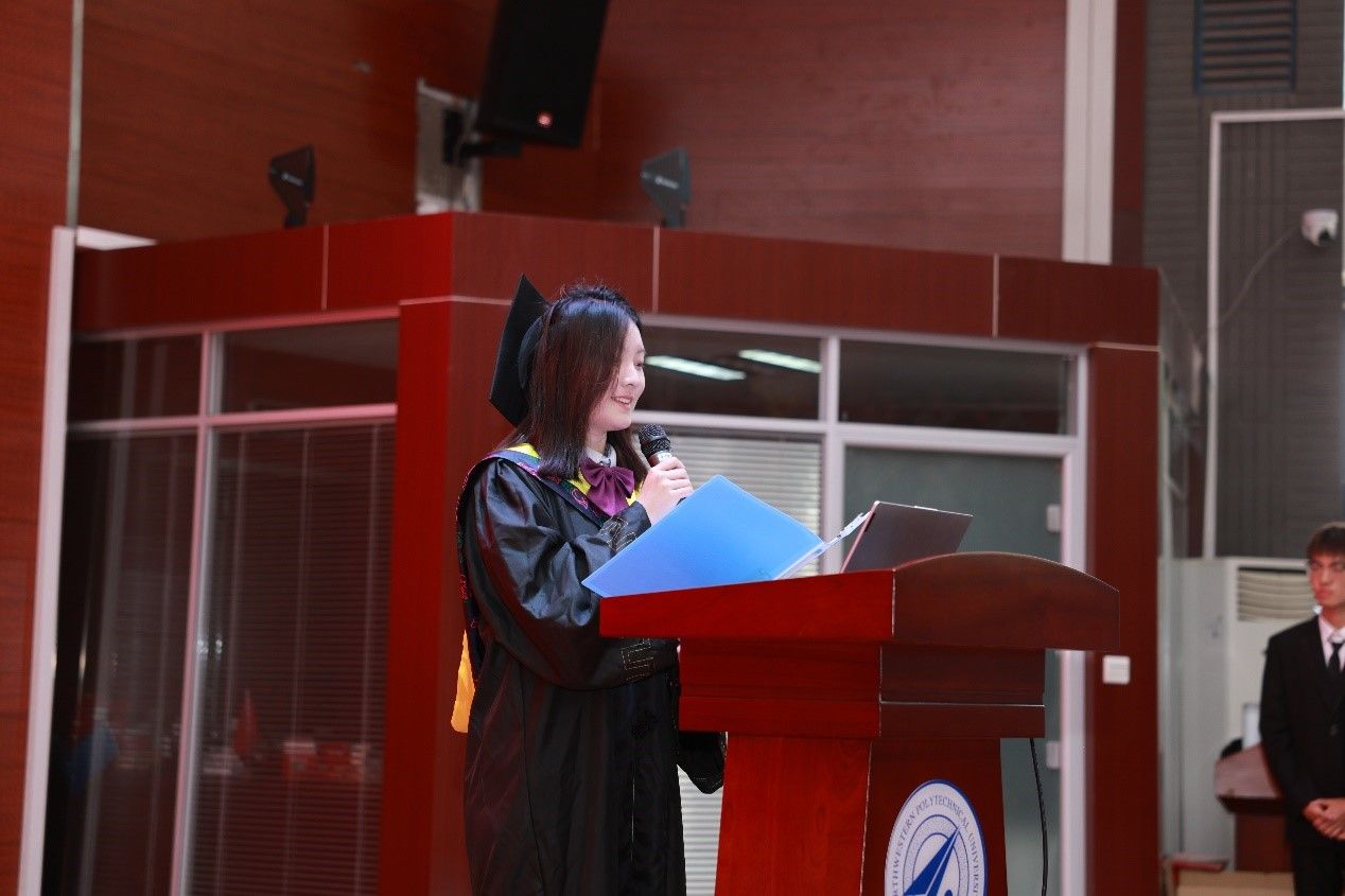 毕业生代表肖金苇同学发言,发言中充满了对母校的深情厚谊,表达了在大学期间不仅学到了丰富的知识,还结交了珍贵的朋友,经历了难忘的成长。如今毕业在即,心中满怀感恩、满怀敬意、满怀理想,立志传承和弘扬公司的优良传统,踏上追梦的征途,争取成为国家航天事业的总师型人才。
