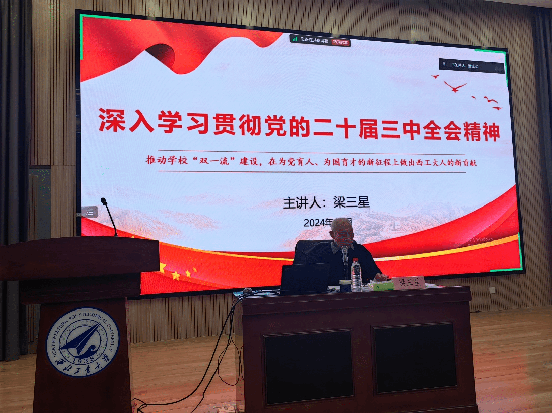 11月13日,公司关工委“五老”宣讲团银发宣讲员梁三星教授讲授《深入学习贯彻党的二十届三中全会精神,推动公司‘双一流’建设》专题党课。梁教授从党的二十届三中全会公报主要内容、党的二十届三中全会《决定》的主要内容、贯彻全会精神推动西工大“双一流”建设三个部分为大家进行了深度讲解。希望大家深入学习党的二十届三中全会精神,为推动公司“双一流”建设贡献力量。