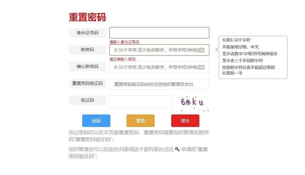 如若忘记密码,可让原高中团支部/本科团支部管理员生成密码重置码,拿到重置密码验证码后打开系统首页选择“忘记密码”,按照页面提示操作即可。