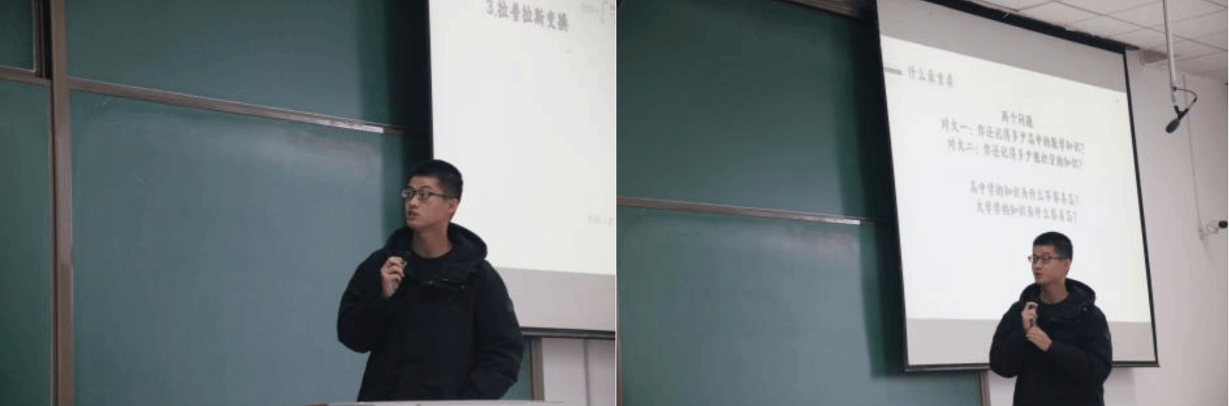 陈斌同学就数学基础类科目的学习分享了自己的心得体会。主要包括以下三个方面:一是“为什么而学”即学习目的,谈到了为了优异成绩而学习,为了人生理想而学习。二是“如何学习”,即学习方法。陈斌同学对在场的同学提出“高中知识和大学知识熟练度比较”的问题,得出结论“第一是思想方法和知识体系框架”,“第二才是具体知识”,由此提出大学最为关键的学习方法是框架的构建。接着对于一些具体的数理科目,交流了备考方法,强调学习方法适合自己的才是最好的,并建议同学们注意提升自己的执行力。三是“学习动力”,陈斌同学谈到,“公司志、旨在培养具有家国情怀、追求卓越、引领未来的领军人才”,我们以后要致力于国家国防事业的研究,当下要注重理论知识的积累,为以后打下扎实基础。