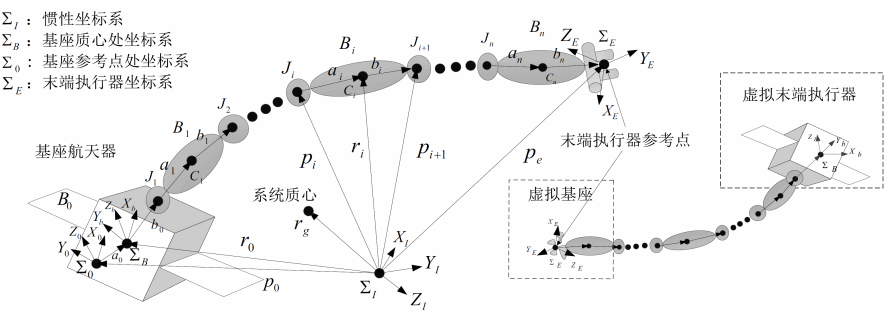 将末端执行器视为虚拟基座的空间机器人建模示意图