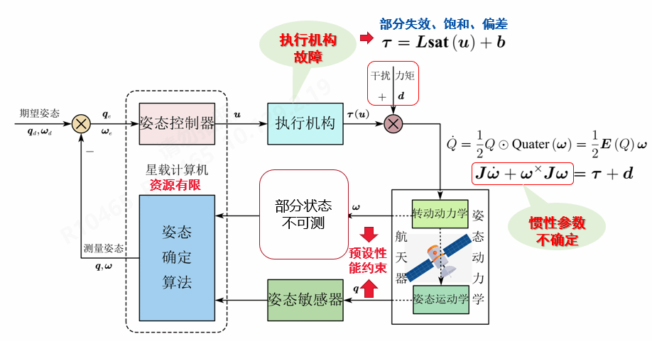 本论文依托williamhill官网空间操作技术研究所航天飞行动力学技术国家级重点实验室,面向国家航天领域重大需求开展研究,主要针对在轨服务任务中普遍存在的惯性参数不确定、未知动态干扰、执行机构故障、部分状态不可测和全状态运动约束等问题,考虑实际工程中航天器有限的燃料能源和计算资源等条件限制下,基于自适应控制方法,开展具有渐近收敛特性的航天器姿态跟踪自适应理论、方法研究(图2)。主要的研究内容和成果可以概括为以下几个方面: