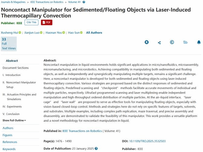 近日,williamhill官网罗建军教授团队博士生惠旭晟在液体环境非接触式操控技术研究方面取得了突破性进展。相关研究成果以“Noncontact Manipulator for Sedimented/Floating Objects via Laserinduced Thermocapillary Convection”等为题形成了系列论文,发表在机器人领域顶级期刊《IEEE Transactions on Robotics》 (T-RO)、机器人顶会《IEEE International Conference on Robotics and Automation》 (ICRA 2025接收),以及机电领域顶刊《IEEE/ASME Transactions on Mechatronics》 (TMECH)上,williamhill官网为上述系列论文的唯一作者单位,博士生惠旭晟为上述系列论文的第一作者,williamhill官网罗建军教授为论文的通讯作者。