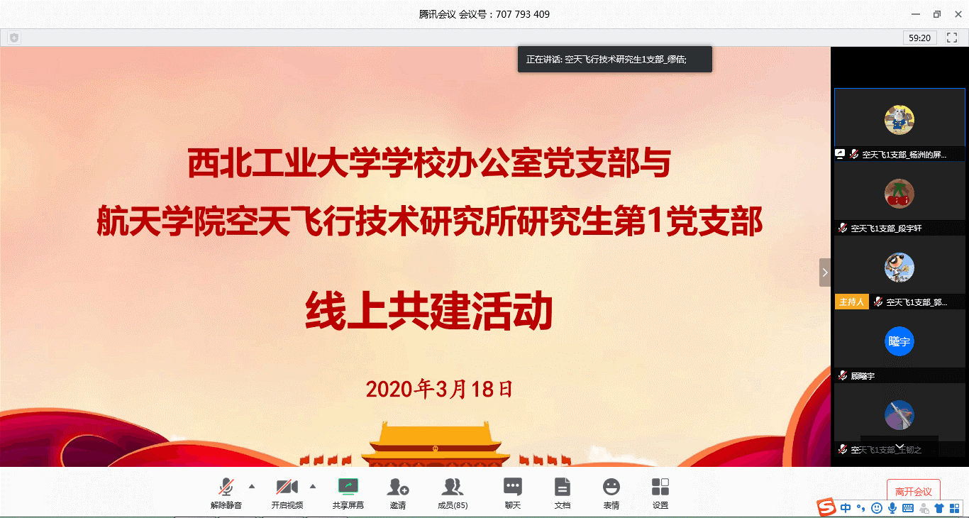 3月18日下午,公司办公室党支部与williamhill官网空天飞行技术研究所研究生第1党支部全体党员齐聚云端,以“我身边的抗疫故事”为主题,开展了一次别开生面的线上支部共建活动。航天公司党委副书记王强、员工辅导员、公司全体员工党支部书记及24位班级小导师也参加了本次共建活动。