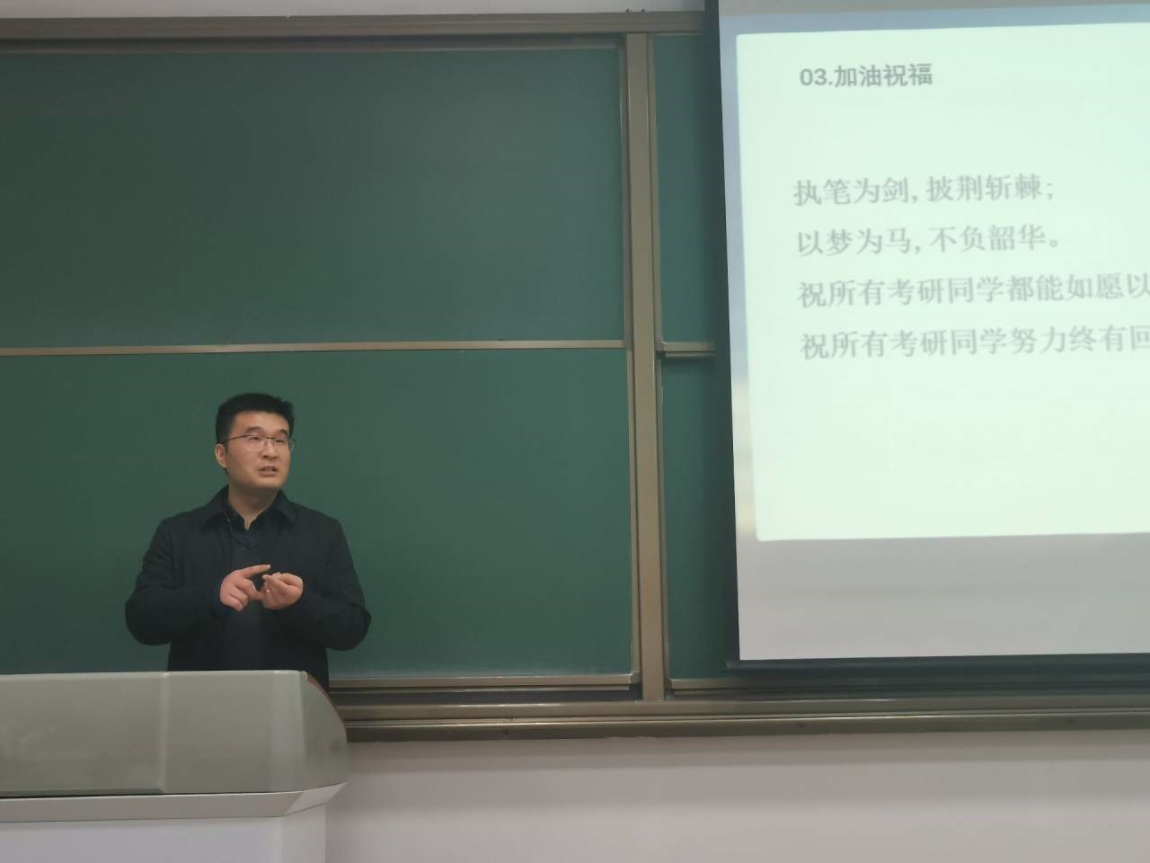 随后,副书记王强发言,表达了对同学们深切的关爱和鼓励。他对党支部组织本次活动表示感谢,并向同学们提出关于如何在冲刺阶段调整好心态、更好地复习和参加考试提出针对性的意见和建议。王强表示,考研将至,要把压力抛到脑后,坚持做到思想不抛锚,在这几天中,同学们要打起十二分的精神,规律作息、查漏补缺,通过模拟练习来保持自己的答题状态;王强强调,在为期两天的考试中,要调整好自己的心理状态,积极乐观的面对考试,不要有任何的压力,将自己掌握的内容呈现在试卷上,就是成功的。他鼓励大家从容面对考试,不要有任何的心理负担,千万不能中途放弃。最后,王强回忆起自己班级当年为考研同学做好后勤工作的事情,指出大家一定要互相关心、关爱和帮扶,针对保研的同学们,王强希望大家应尽量成为考研同学们的坚强后盾,应积极主动地关心并帮助他们,把作息调整至与考研同学一致,助其顺利完成考试。