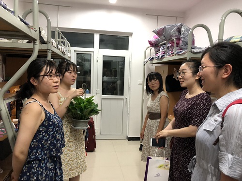 慰问小组一行人走访了新生入住的1号楼B座女生宿舍。每到一个宿舍,两位老师都送去了公司为大家准备的绿萝,希望绿萝可以妆点大家的宿舍,使宿舍更有家的感觉。