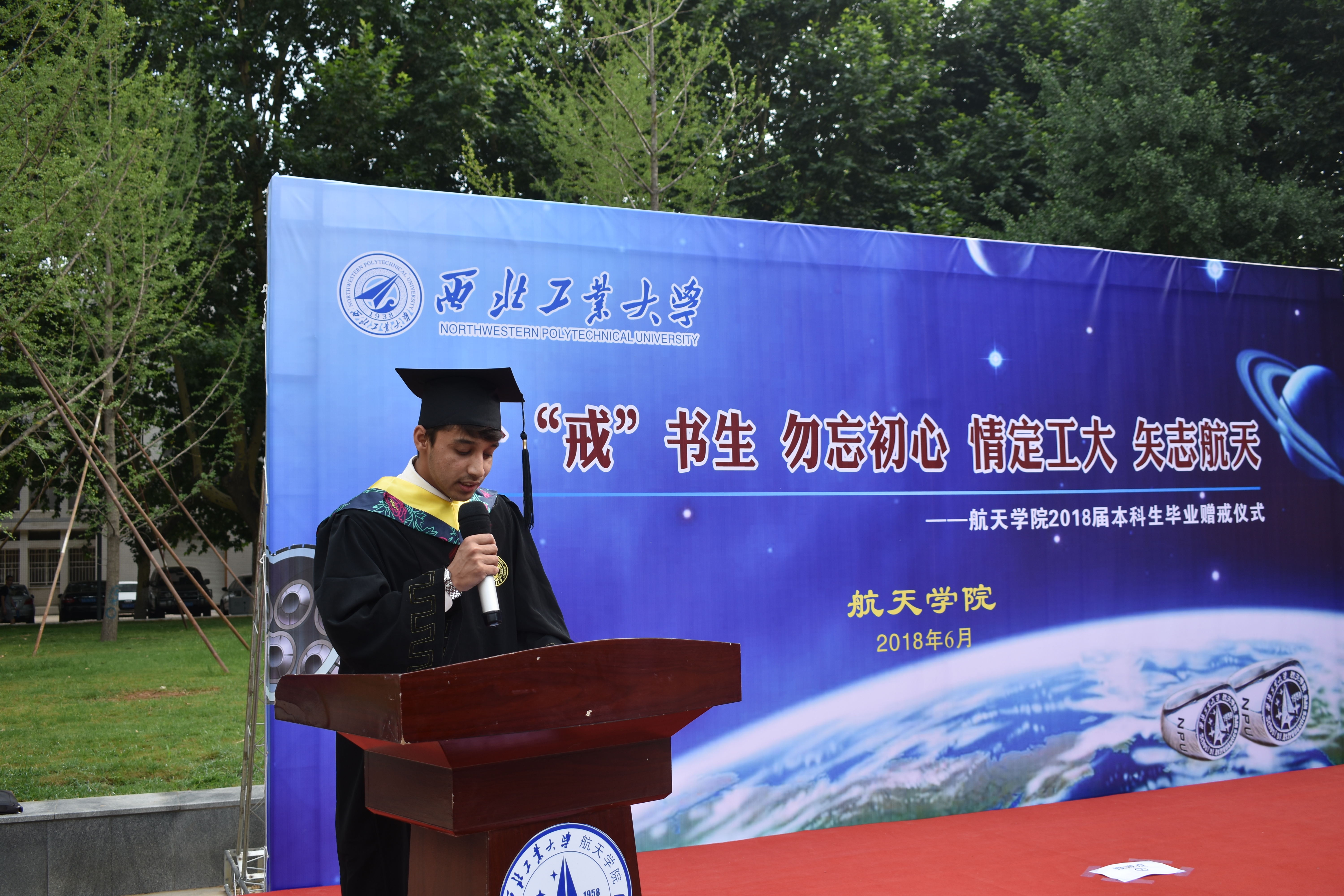 随后,williamhill官网经理唐硕宣读了《关于表彰williamhill官网2018届优秀毕业本科生的决定》,并对索文博等14名获得优秀毕业本科生称号的同学表示祝贺。接着,williamhill官网史上第一位本科毕业职工FAHART发言表示感谢williamhill官网辛勤培养并向williamhill官网赠送泰姬陵模型,williamhill官网经理唐硕为其授予航天戒。一枚航天戒,联系的是所有航天学子的心,无论肤色,无论国籍。然后,2018届本科毕业生代表何金阳同学发言,她带大家回顾了求学路上的点点滴滴,并深有感触的说,“毕业并不代表结束,而是宣布另一个开始。”